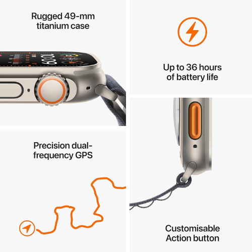 - EXTREMELY RUGGED, INCREDIBLY CAPABLE—49mm corrosion-resistant titanium case. Large Digital Crown and customizable Action button for instant control over a variety of functions. 100m water resistance.